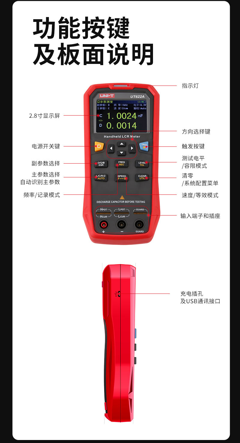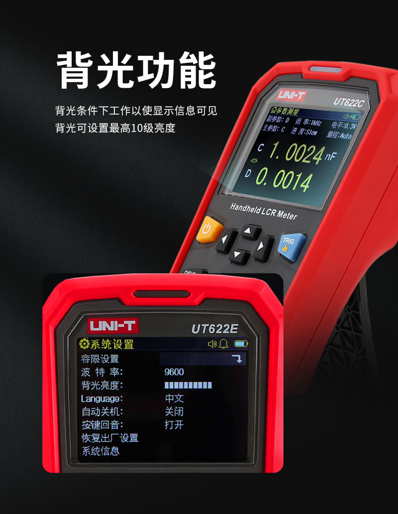 UT622系列LCR数字电桥是用于测量电感、电容、电阻等元件参数的便捷手持式测量仪器,体积小巧,采用 3.7V 1800mAh锂聚合物电池供电或外部电源适配器供电,既可适用于台式机的应用场所,更为流动测量和手持测量场合提供了极大方便。仪器操作简洁直观,测试频率、参数、速度选择即按即现。