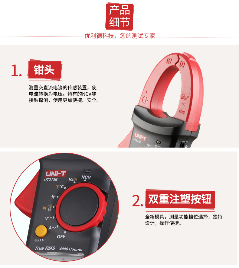 UT213系列数字钳形表包含以下型号:UT213C(NCV测量 真有效值 交流电流400A),/UT213B(NCV测量 真有效值 交流电流400A)/UT213A(NCV测量 交流电流400A)/