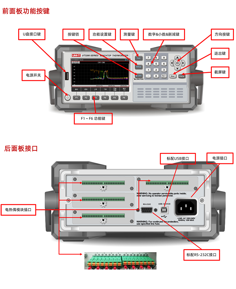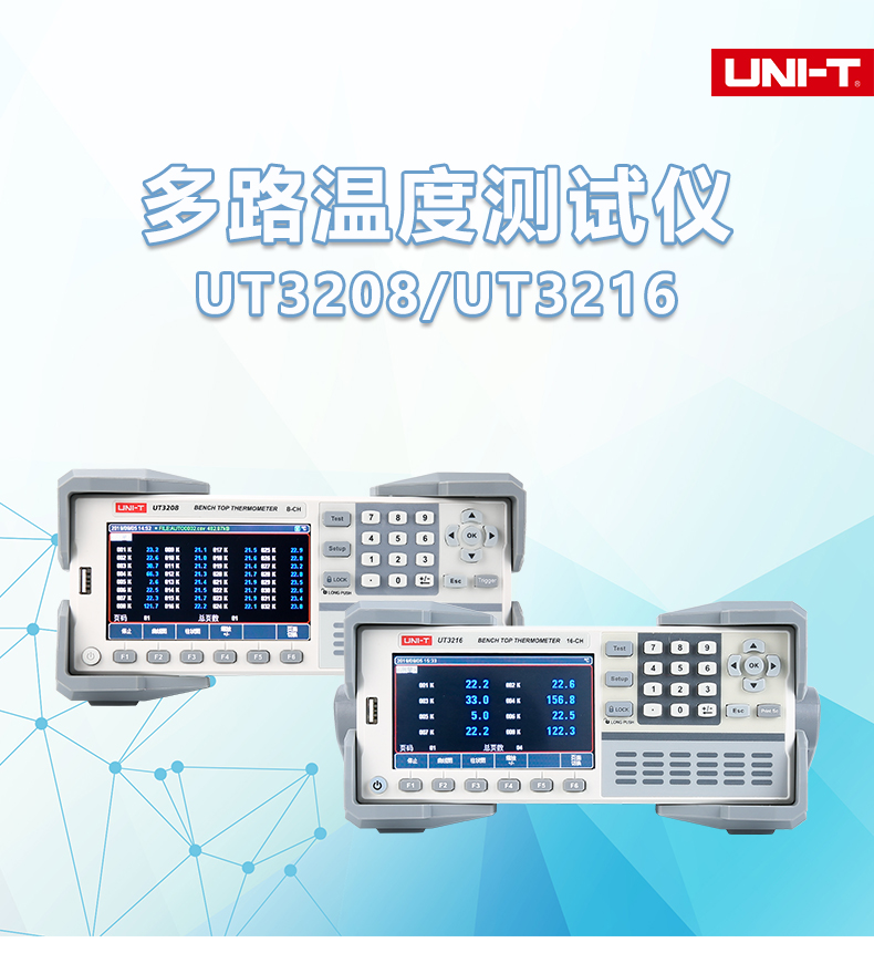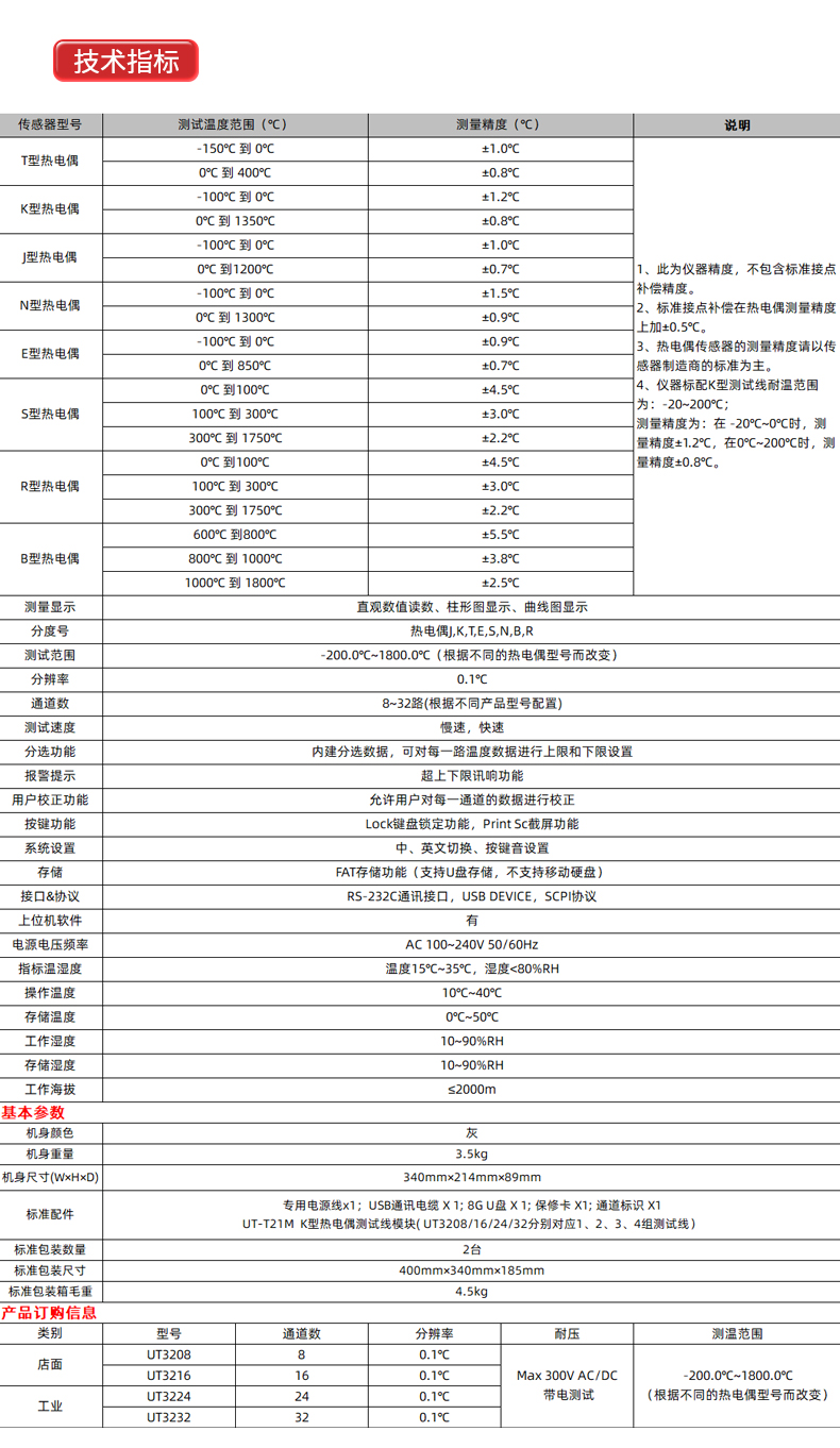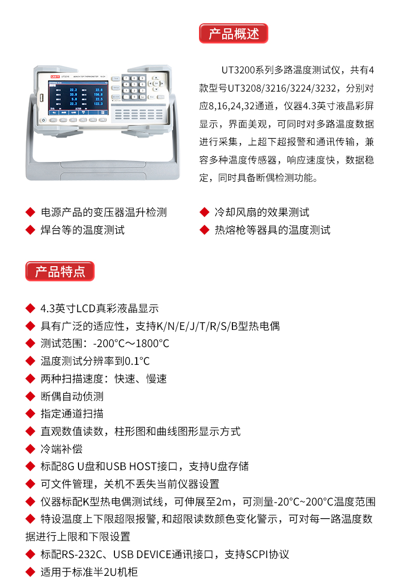 UT3200系列多路温度测试仪包含以下型号:UT3208(8通道数/温度-200~1800℃),/UT3216(16通道数/温度-200~1800℃)/UT3224(24通道数/温度-200~1800℃)/UT3232(32通道数/温度-200~1800℃)