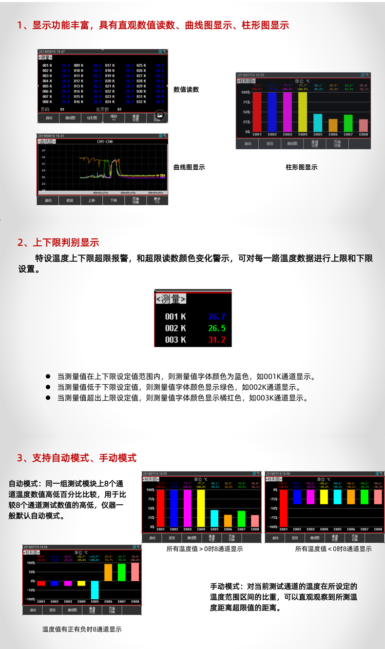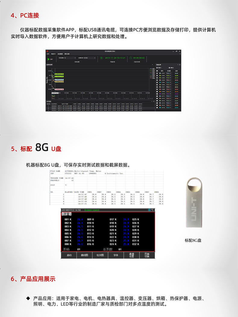 UT3200系列多路温度测试仪包含4款型号分别为UT3208, UT3216, UT3224和UT3232, 其区别在于四款型号分别对应8、16、24和32路热电偶测试通道数。本系列采用4.3英寸液晶显示屏,仪器支持-200℃~1800℃的测试范围,支持J,K,T,E,S,N,B,R型热电偶输入。可同时对多路温度数据进行采集。