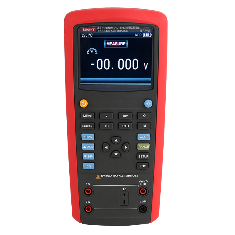 UT714是一款高性能,高精度,手持式,多功能温度校准仪。0.02%的高精度直流电压测量和输出功能,可分别测量及输出10种热电阻和10种热电偶。具有自动步进和自动徐坡输出功能,可用于快速线性度检测;功能设置存储使得系统设置更加快捷;数据传输功能,使用户可以快速进行测试通信。