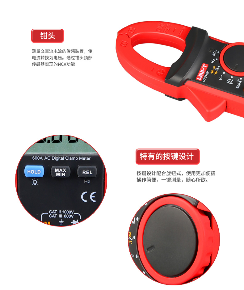 UT216系列数字钳形表包含以下型号:UT216D(NCV/浪涌电流测量),/UT216B(NCV/交流电流600A)