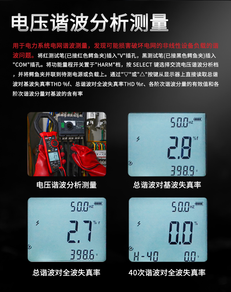 UT219P是一款交流基波频率达到1kHz的手持式谐波交流功率钳表,可用于测量交流电压、交流电流、有功功率、视在功率、无功功率、功率因素、相位角、电能统计、频率、相序、总谐波失真率及各谐波分量等参数,并具有单相、三相三线式、三相四线式测量模式,配备蓝牙通讯功能,可通过手机或平板电脑对测量数据进行监控和记录,生成具有专业水准的报表,操作简便、性能稳定。