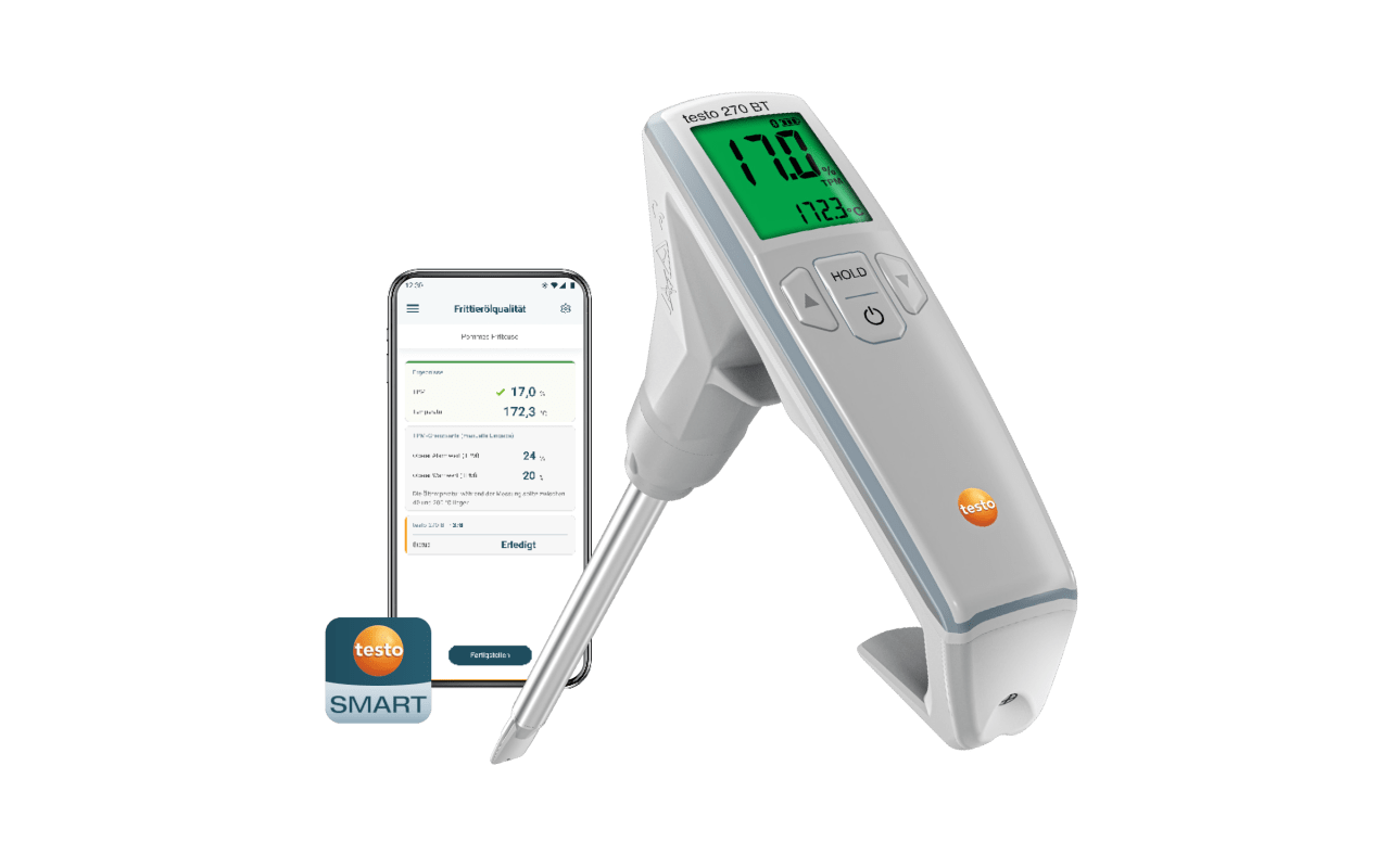 使用全新 testo 270 BT 优化煎炸流程,更轻松地管理煎炸产品品质,同时减少油耗。