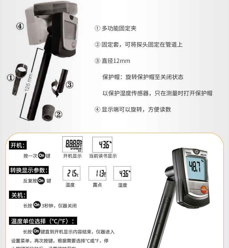 testo 605-H1温湿度仪,配有管道支架,包含多功能夹和电池。
