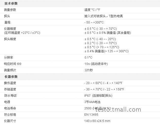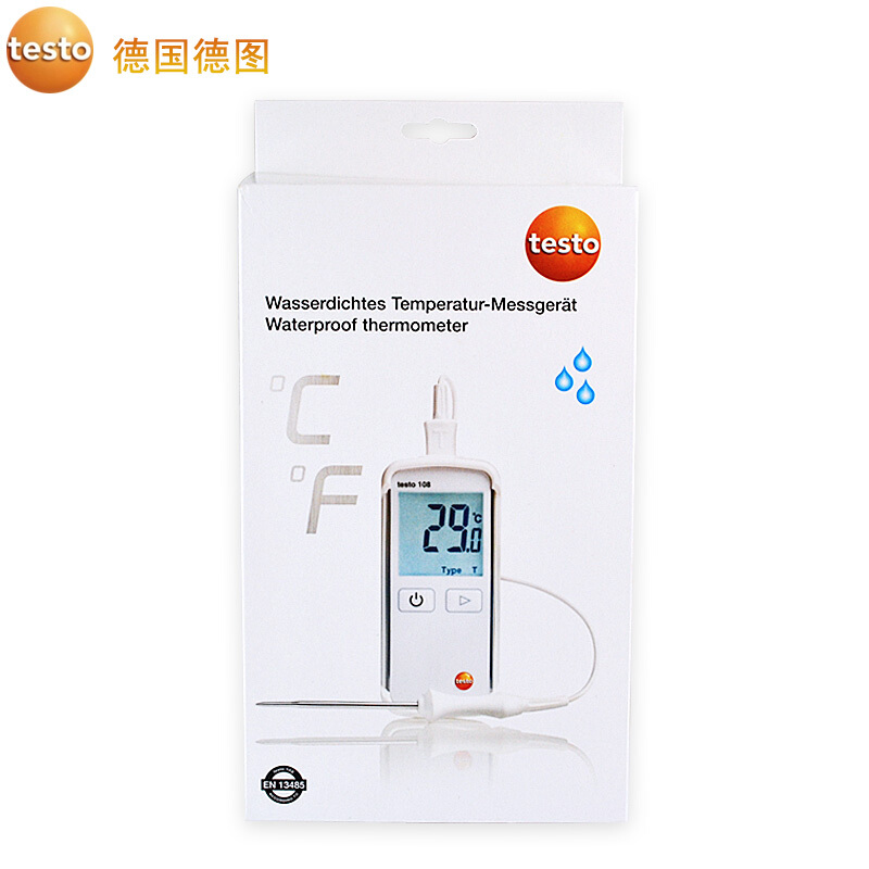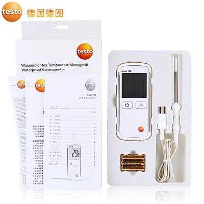 testo 108-2 防水型食品温度仪。含主机、一个旋入式可锁T型热电偶探头、保护软套和出厂报告。防水等级 IP 67。