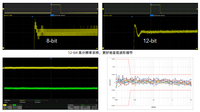 · 12-bit高分辨率ADC采样,更好地呈现波形细节。相比于普通的8-bit示波器256级量化等级,12-bit示波器可达到4096级,是普通示波器的16倍,具备更小的量化误差。