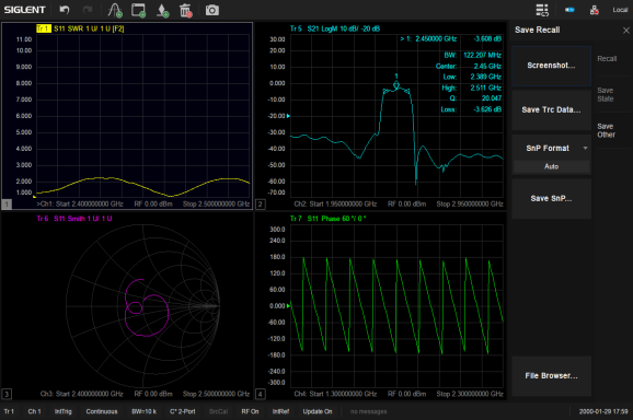 除开外观设计,其先进的用户界面,配合上12.1英寸超大触摸屏与外接的鼠标和键盘,让工程师能更快的添加或删除窗口,通道和迹线。SNA5000A支持在多个窗口下,添加多条迹线进行S参数测量。并且测量结果,可以多种数据格式显示,如 Log Mag,Lin Mag,Phase,Delay,Smith,SWR,Polar等,可以方便快捷地分析被测物的传输系数,反射系数,驻波比,阻抗匹配,相位,延时等参数。
