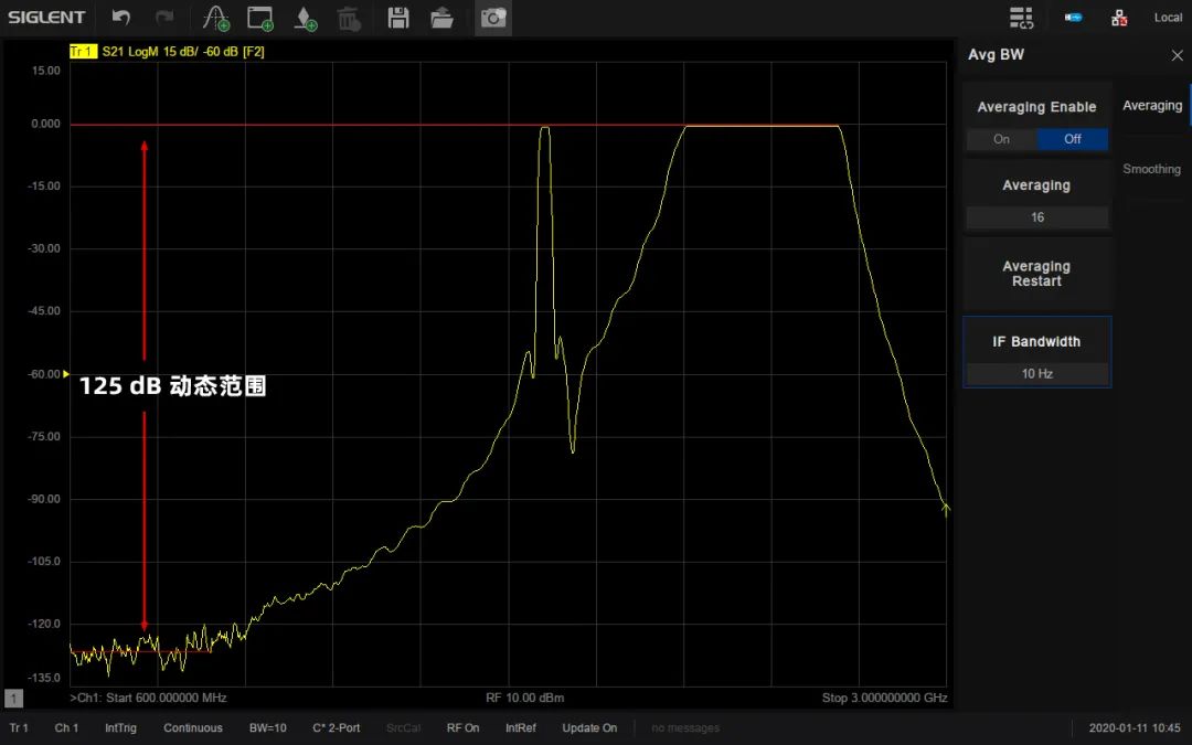 系统动态范围是VNA一个非常重要的指标,它是VNA源的最大输出功率与测试端口本底噪声的差值。SNA5000A拥有最大125 dB的动态范围,可适用于对动态范围要求比较高的测试场景,比如同时测量滤波器的通带和带外抑制性能。