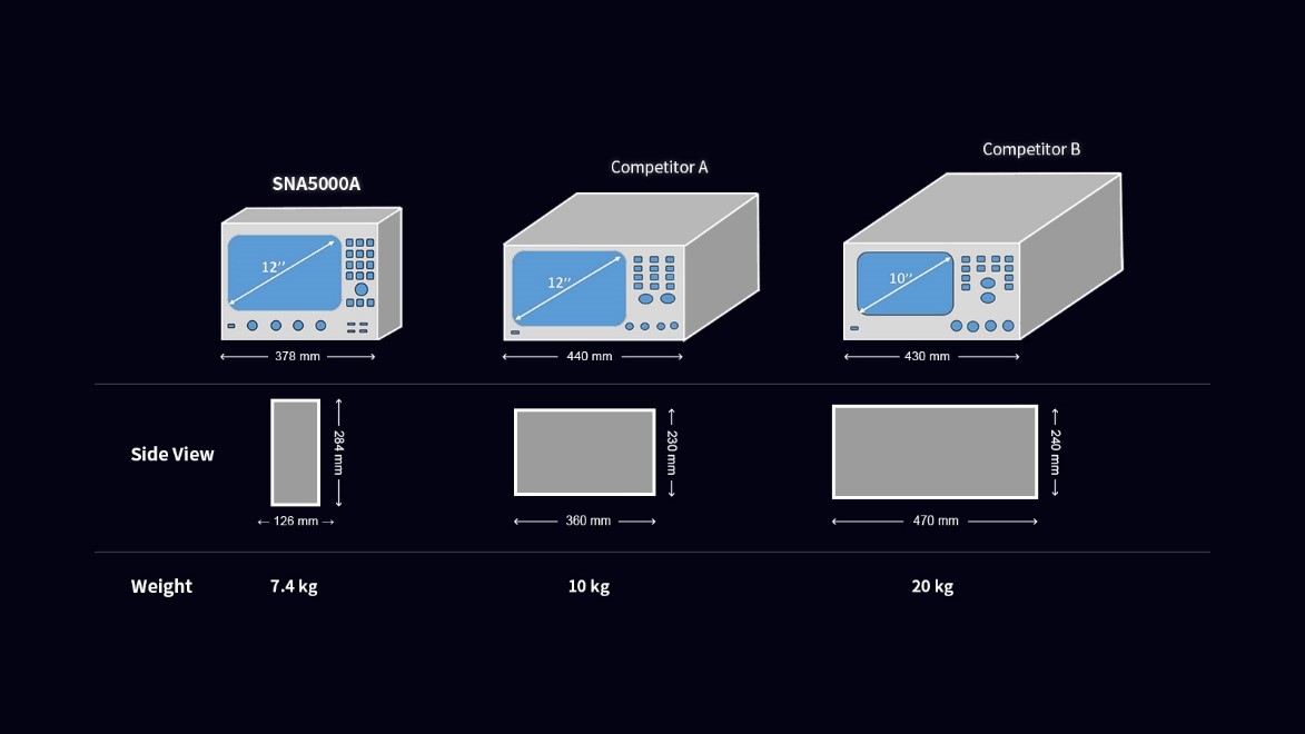 不管是在研发还是在现代化的生产线,区别于传统笨重的矢量网络分析仪,SNA5000A超前的外观设计都能为工程师或者产线节省大量的桌面空间。