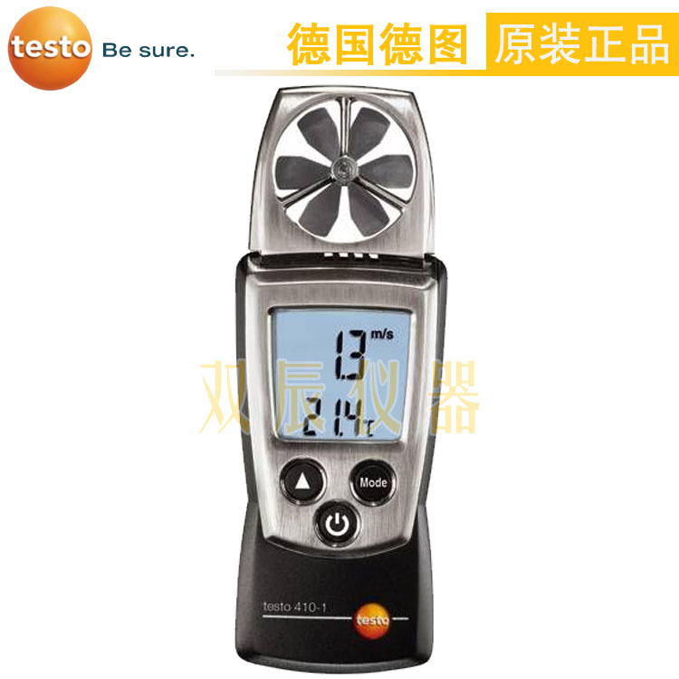 testo 410-1叶轮风速仪,用于测量风速和环境温度,配备防护盖、腕带和电池,附有出厂报告。